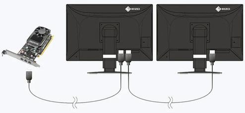 Via Signal-Ein- und -Ausgang können Sie mehrere RadiForce-Monitore mit deren DisplayPort-Schnittstelle verketten (Daisy-Chain-Verfahren). Dadurch können Sie Mehrschirmlösungen ohne lästige und übermäßige Verkabelung sehr unkompliziert realisieren.