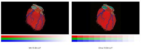 Die Farbwiedergabe wird über eine 13-Bit-Look-Up-Table (LUT) gesteuert. Bei DisplayPort-Anschluss stehen davon für die Anzeige bis zu 10 Bit zur Verfügung. Das bewirkt eine Auflösung mit maximal 1 Milliarde Farbtönen. Die für Befundung erforderlichen Wiedergabekennlinien und Feinstrukturen sind somit präzise zu erkennen.