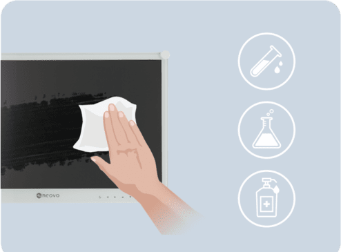 Das robuste Metallgehäuse und die exklusive Vorderseitig IP65 geschützte NeoV™ Optical Glasoberfläche bieten maximalen Schutz des Panels – übrigens auch vor herkömmlichen Reinigungs- und Desinfektionsmitteln.